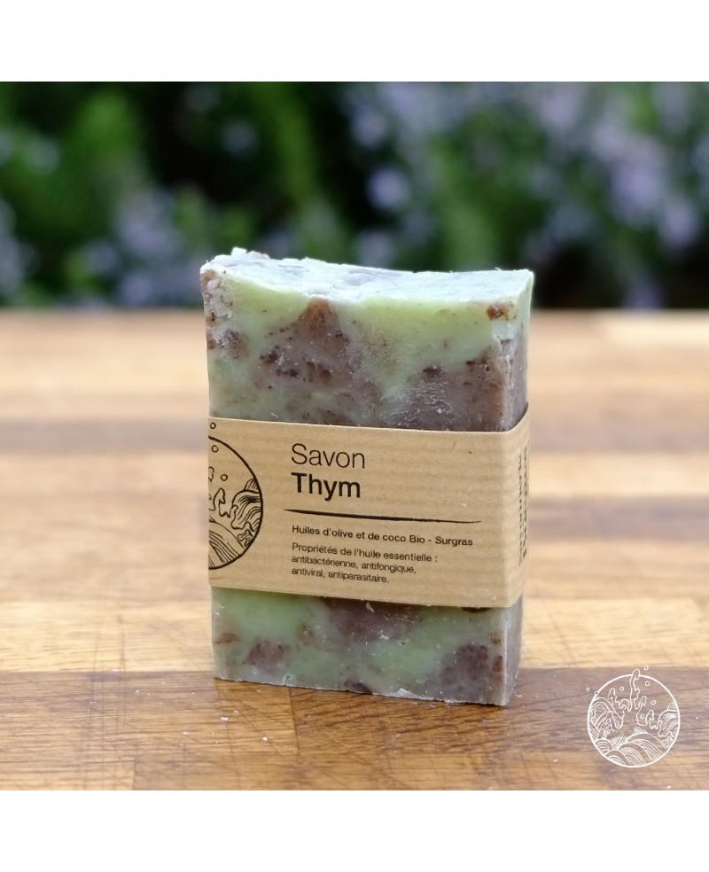 Savon au thym : savon naturel au parfum frais et herbacé, reconnu pour ses propriétés purifiantes, tonifiantes et antiseptiques. Idéal pour peaux mixtes à grasses ou sujettes aux imperfections, il nettoie en profondeur tout en laissant une sensation de fraîcheur. 🌿